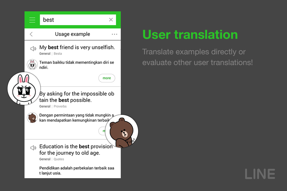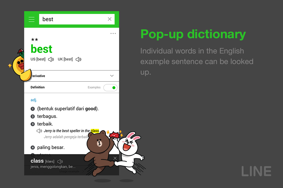 Buat yang bingung nyari aplikasi kamus buat android. Aplikasi kamus dari line ini bisa menjadi salah satu pilihan untuk kamu karena dalam aplikasi ini terdapat beberapa fitur yang bisa kamu gunakan agar bisa menerjemahkan indonesia ke inggris, maupun inggris ke indonesia. Nah, kamu bisa mendownload aplikasi ini melalui link dibawah, setelah terdownload, kamu bisa instal di smartphone mu dan langsung digunakan.